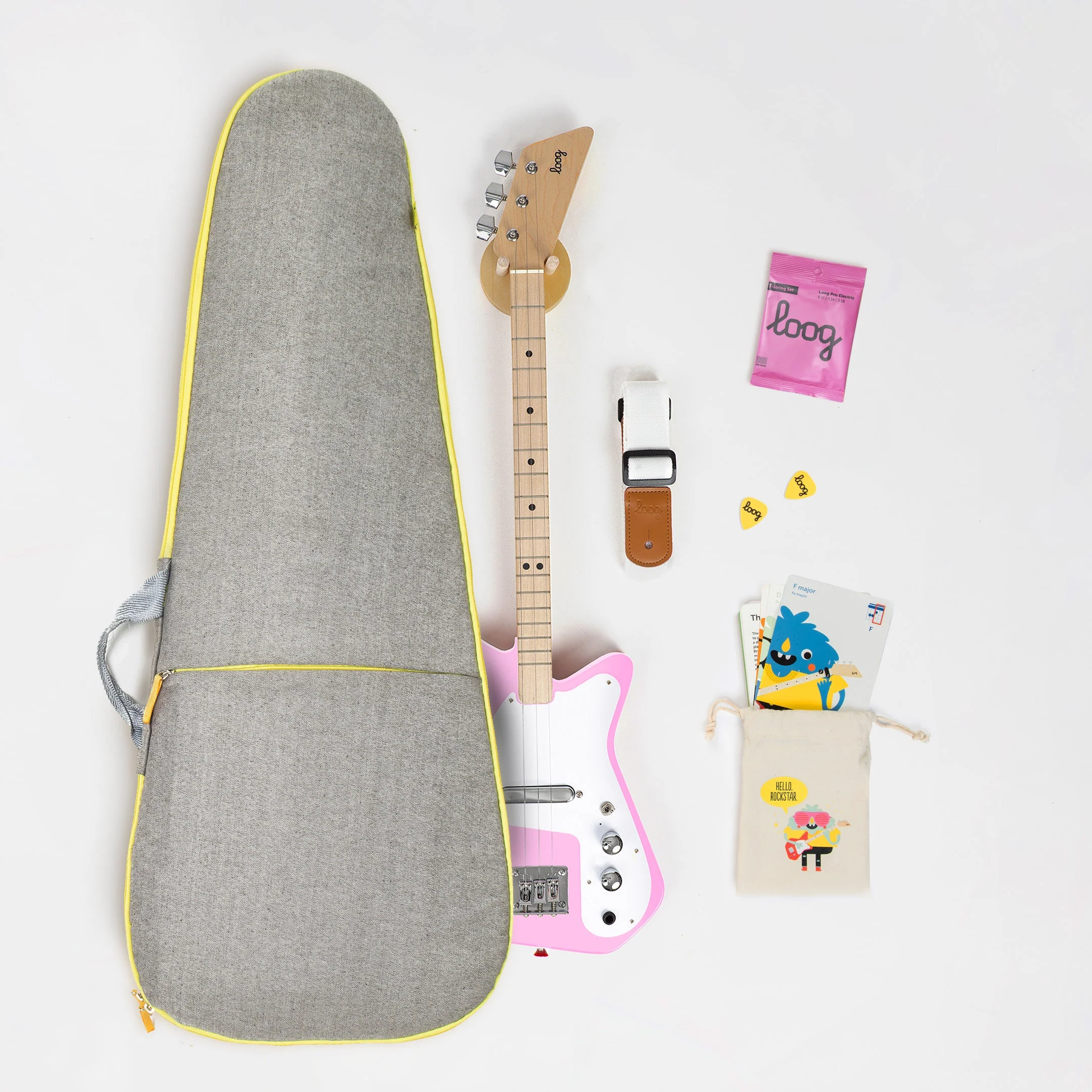 - Electric guitar strings and standard guitar tuning: Learn on a Loog, play any guitar.